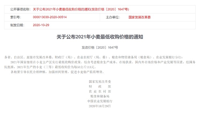 關(guān)于2021年小麥最低收購(gòu)價(jià)有關(guān)政策的通知各省、自治區(qū)、直轄市發(fā)展改革委、糧食和物資儲(chǔ)備局(糧食局)、財(cái)政廳(局)、農(nóng)業(yè)農(nóng)村廳(局、委)、農(nóng)業(yè)發(fā)展銀行分行,中國(guó)儲(chǔ)備糧管理集團(tuán)有限公司、中糧集團(tuán)有限公司、中國(guó)供銷集團(tuán)有限公司、中國(guó)中化集團(tuán)有限公司:為保障國(guó)家糧食安全,進(jìn)一步完善糧食最低收購(gòu)價(jià)政策,2021年繼續(xù)對(duì)最低收購(gòu)價(jià)小麥限定收購(gòu)總量?,F(xiàn)將具體事項(xiàng)通知如下。根據(jù)近幾年小麥最低收購(gòu)價(jià)收購(gòu)數(shù)量,限定2021年最低收購(gòu)價(jià)小麥?zhǔn)召?gòu)總量為3700萬(wàn)噸。(一)分批下達(dá)。限定收購(gòu)總量分兩批次下達(dá),第一批數(shù)量為3330萬(wàn)噸,不分配到??;第二批數(shù)量為370萬(wàn)噸,視收購(gòu)需要具體分配到省。當(dāng)最低收購(gòu)價(jià)全國(guó)收購(gòu)總量達(dá)到第一批數(shù)量的90%時(shí),中儲(chǔ)糧有關(guān)分公司應(yīng)會(huì)同省級(jí)糧食等部門單位及時(shí)提出本省第二批收購(gòu)的計(jì)劃數(shù)量建議。中儲(chǔ)糧集團(tuán)公司根據(jù)當(dāng)年小麥產(chǎn)量、收購(gòu)量、農(nóng)戶余糧和市場(chǎng)價(jià)格等情況統(tǒng)籌平衡各省數(shù)量后,報(bào)國(guó)家糧食和物資儲(chǔ)備局批準(zhǔn)。國(guó)家糧食和物資儲(chǔ)備局通過(guò)政府網(wǎng)站公布各省第二批收購(gòu)數(shù)量。在第一批收購(gòu)?fù)瓿珊?,有關(guān)省份按照批準(zhǔn)的第二批數(shù)量繼續(xù)開展收購(gòu)。當(dāng)收購(gòu)量達(dá)到本省批準(zhǔn)數(shù)量時(shí),立即停止該省最低收購(gòu)價(jià)收購(gòu)且不再啟動(dòng)。(二)動(dòng)態(tài)監(jiān)測(cè)。啟動(dòng)最低收購(gòu)價(jià)執(zhí)行預(yù)案后,中儲(chǔ)糧集團(tuán)公司要嚴(yán)格按照預(yù)案有關(guān)規(guī)定,加強(qiáng)統(tǒng)計(jì)監(jiān)測(cè),每五日向國(guó)家糧食和物資儲(chǔ)備局報(bào)送收購(gòu)進(jìn)度;啟動(dòng)第二批收購(gòu)后,中儲(chǔ)糧集團(tuán)公司要按日?qǐng)?bào)送收購(gòu)進(jìn)度。國(guó)家糧食和物資儲(chǔ)備局定期通過(guò)政府網(wǎng)站公布最低收購(gòu)價(jià)全國(guó)收購(gòu)總量。省級(jí)糧食等有關(guān)部門要結(jié)合小麥商品量和農(nóng)戶余糧情況,及時(shí)開展調(diào)研調(diào)度,全面掌握收糧進(jìn)度。(一)認(rèn)真落實(shí)限量收購(gòu)政策。中儲(chǔ)糧集團(tuán)公司作為最低收購(gòu)價(jià)政策執(zhí)行主體,要嚴(yán)格執(zhí)行限定收購(gòu)總量的收購(gòu)政策,不得超量收購(gòu)。財(cái)政資金支持限于最低收購(gòu)價(jià)政策下的最高收購(gòu)總量?jī)?nèi)。(二)加強(qiáng)市場(chǎng)監(jiān)管。各地要認(rèn)真落實(shí)糧食收儲(chǔ)制度改革精神,規(guī)范糧食流通市場(chǎng)秩序,依法依規(guī)嚴(yán)厲查處糧食收儲(chǔ)過(guò)程中的違法違規(guī)行為。(三)促進(jìn)“優(yōu)糧優(yōu)價(jià)”。各地要積極鼓勵(lì)農(nóng)企對(duì)接,充分發(fā)揮市場(chǎng)價(jià)格對(duì)生產(chǎn)的反饋引導(dǎo)作用,促進(jìn)種植結(jié)構(gòu)調(diào)整優(yōu)化,增加綠色優(yōu)質(zhì)安全產(chǎn)品供給。