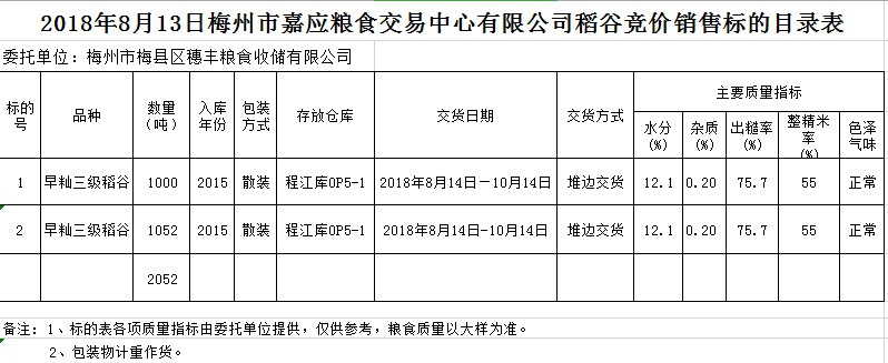 受客戶委托,梅州市嘉應(yīng)糧食交易中心有限公司定于2018年8月13日(星期一)舉辦糧食競價(jià)交易會(huì),梅州市梅縣區(qū)穗豐糧食收儲(chǔ)有限公司擬銷售2015年早秈稻2052噸。