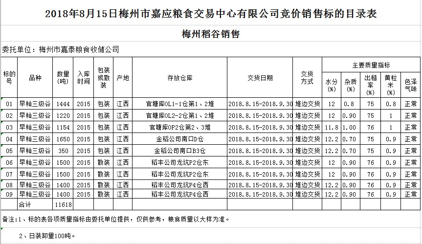 受客戶委托,梅州市嘉應糧食交易中心有限公司定于2018年8月15日(星期三)舉辦糧食競價交易會,梅州市嘉泰糧食收儲公司擬銷售早秈稻11618噸。