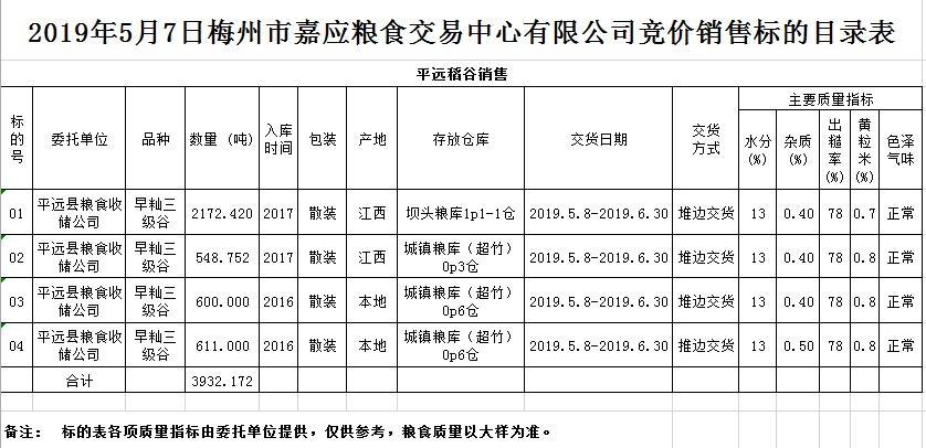 受客戶委托,梅州市嘉應(yīng)糧食交易中心有限公司定于2019年5月7日(星期二)舉辦糧食競(jìng)價(jià)交易會(huì),平遠(yuǎn)縣糧食收儲(chǔ)公司擬銷售2016年早秈稻1211噸,2017年早秈稻2721.172噸。
