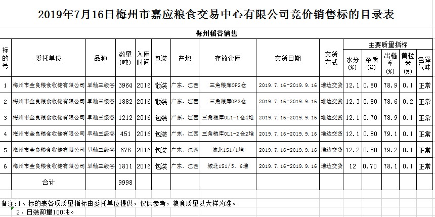 交易時間和地點:2019年7月16日(星期二)上午10時20分。廣東省梅州市彬芳大道南161號梅州市糧食交易中心3樓。