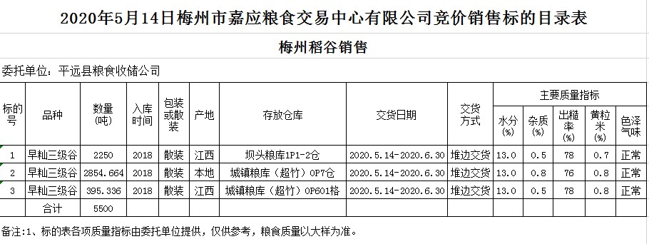 受客戶委托,梅州市嘉應(yīng)糧食交易中心有限公司定于2020年5月14日(星期四)舉辦糧食競(jìng)價(jià)交易會(huì),平遠(yuǎn)縣糧食收儲(chǔ)公司擬銷售2018年早秈稻5500噸。