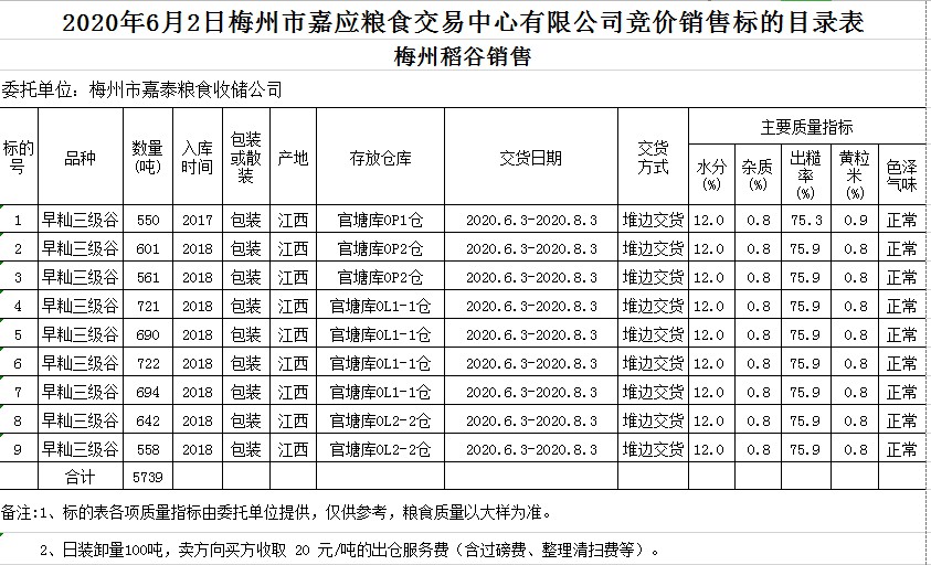 受客戶委托,梅州市嘉應(yīng)糧食交易中心有限公司定于2020年6月2日(星期二)舉辦糧食競價(jià)交易會(huì),梅州市嘉泰糧食收儲(chǔ)公司擬銷售2017年、2018年早秈稻5739噸。