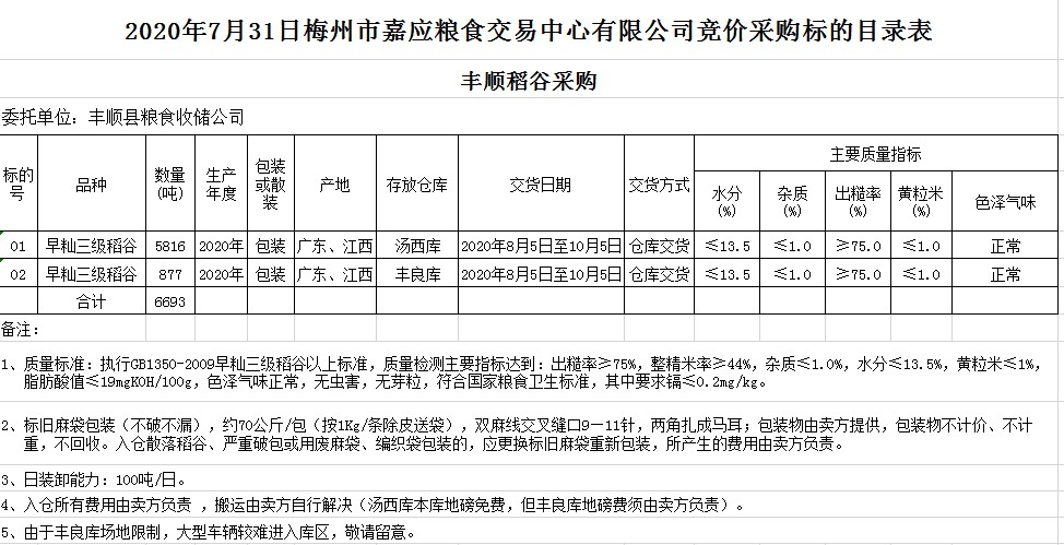 受客戶委托,梅州市嘉應(yīng)糧食交易中心有限公司定于2020年7月31日(星期五)舉辦糧食競價交易會,豐順縣糧食收儲公司擬采購2020年早秈稻6693噸。