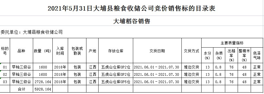 受客戶委托,梅州市嘉應(yīng)糧食交易中心有限公司定于2021年5月31日(星期一)舉辦糧食競(jìng)價(jià)交易會(huì)。大埔縣糧食收儲(chǔ)公司擬銷(xiāo)售2018年早秈稻5928.164噸。