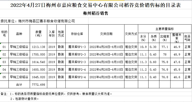 受客戶委托,梅州市嘉應(yīng)糧食交易中心有限公司定于2022年4月27日(星期三)舉辦糧食競(jìng)價(jià)交易會(huì)。梅州市梅縣區(qū)穗豐糧食收儲(chǔ)有限公司擬銷(xiāo)售2019年早秈稻7772.698噸。