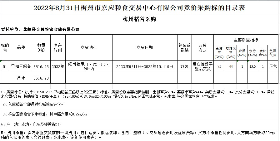 受客戶委托,梅州市嘉應糧食交易中心有限公司定于2022年8月31日(星期三)舉辦糧食競價交易會。蕉嶺縣金穗糧食收儲有限公司擬采購2022年早秈稻3616.93噸。