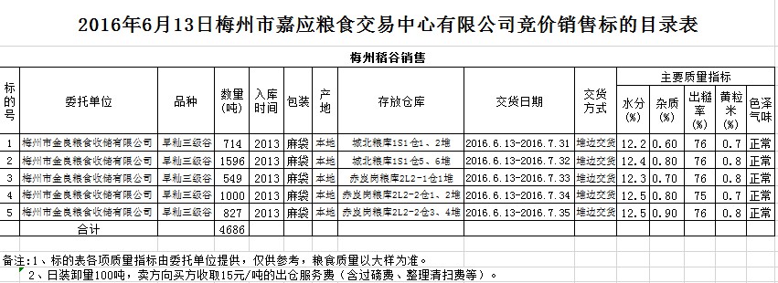 受客戶委托,梅州市嘉應(yīng)糧食交易中心有限公司定于2016年6月13日舉辦糧食競(jìng)價(jià)交易會(huì),梅州市金良糧食收儲(chǔ)有限公司擬銷(xiāo)售2013年早秈稻谷4686噸。