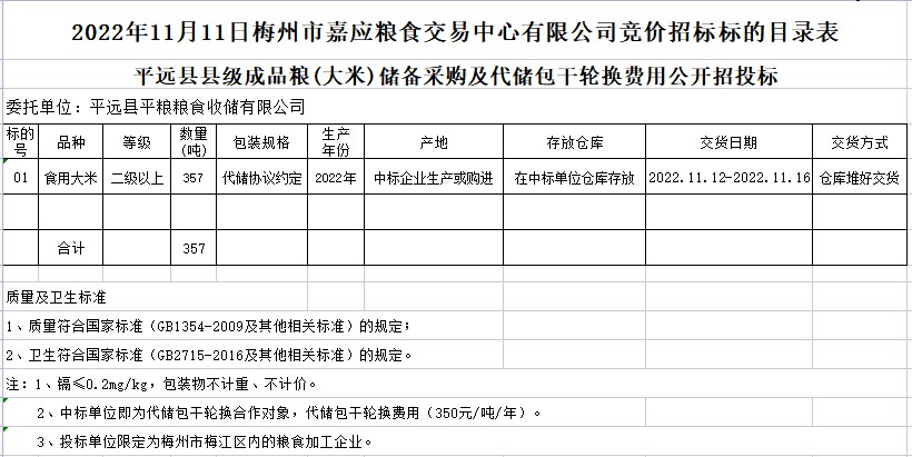 受客戶委托,梅州市嘉應糧食交易中心有限公司定于2022年11月11日(星期五)上午10時在廣東省梅州市彬芳大道南161號梅州市糧食交易中心3樓,舉辦平遠縣縣級儲備成品糧采購公開招標。