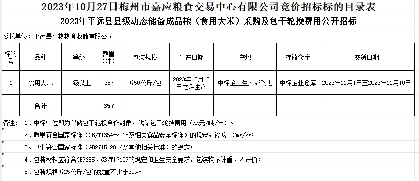 受客戶委托,梅州市嘉應(yīng)糧食交易中心有限公司定于2023年10月27日(星期五)上午10時(shí)在廣東省梅州市彬芳大道南161號(hào)梅州市糧食交易中心3樓,舉辦平遠(yuǎn)縣縣級(jí)成品糧采購(gòu)及包干輪換費(fèi)用公開招標(biāo)。