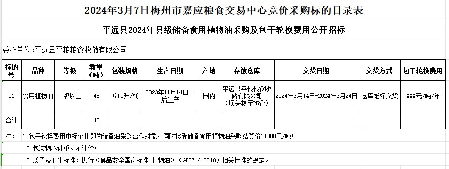 受平遠(yuǎn)縣平糧糧食收儲有限公司委托,梅州市嘉應(yīng)糧食交易中心有限公司定于2024年3月7日(星期四)上午10時舉辦平遠(yuǎn)縣2024年縣級儲備食用植物油采購及包干輪換費(fèi)用公開招標(biāo)。