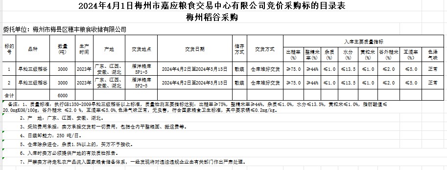 受客戶委托,梅州市嘉應糧食交易中心有限公司定于2024年4月1日(星期一)舉辦糧食競價交易會。梅州市梅縣區(qū)穗豐糧食收儲有限公司擬采購2023年產(chǎn)早秈稻6000噸。