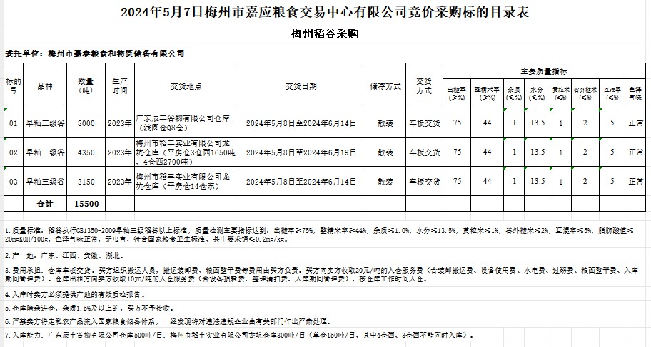 受客戶委托,梅州市嘉應糧食交易中心有限公司定于2024年5月7日(星期二)舉辦糧食競價交易會。梅州市嘉泰糧食和物資儲備有限公司擬采購2023年產早秈稻15500噸。