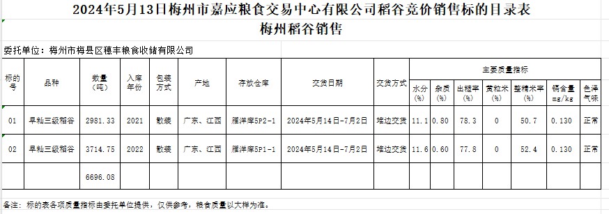 受客戶委托,梅州市嘉應(yīng)糧食交易中心有限公司定于2024年5月13日(星期一)舉辦糧食競價(jià)交易會(huì)。梅州市梅縣區(qū)穗豐糧食收儲有限公司擬銷售2021年、2022年產(chǎn)早秈稻6696.08噸。