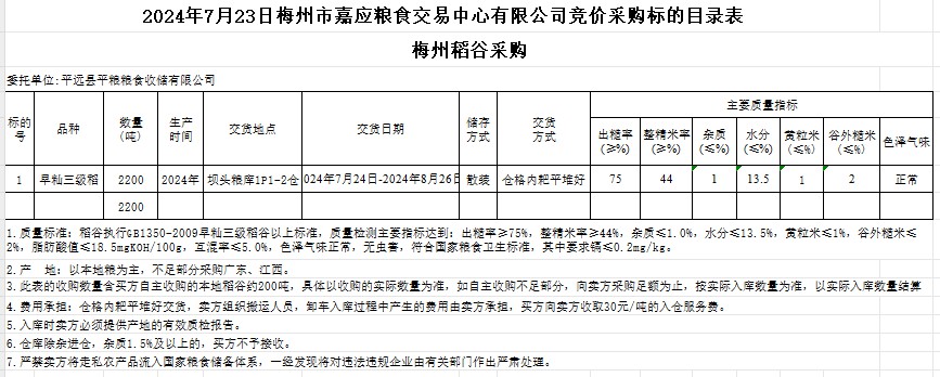 受客戶(hù)委托,梅州市嘉應(yīng)糧食交易中心有限公司定于2024年7月23日(星期二)舉辦糧食競(jìng)價(jià)交易會(huì)。平遠(yuǎn)縣平糧糧食收儲(chǔ)有限公司擬采購(gòu)2024年產(chǎn)早秈稻谷2200噸。
