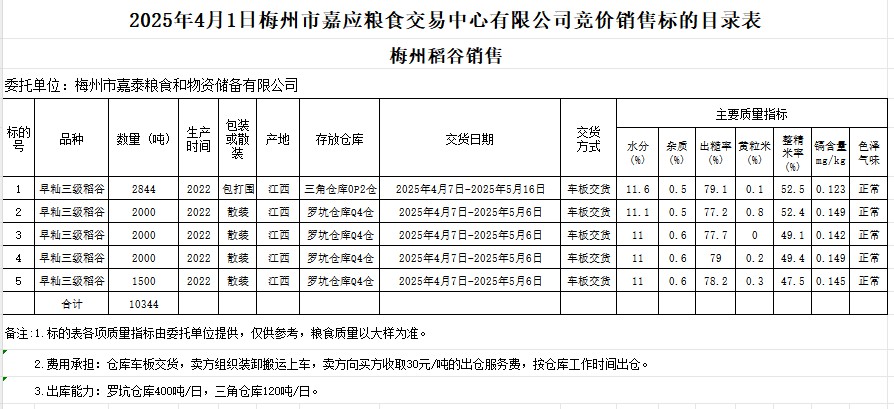 受客戶委托,梅州市嘉應(yīng)糧食交易中心有限公司定于2025年4月1日(星期二)舉辦糧食競價交易會。梅州市嘉泰糧食和物資儲備有限公司擬銷售2022年產(chǎn)早秈稻谷10344噸。