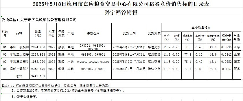 受客戶委托,梅州市嘉應(yīng)糧食交易中心有限公司定于2025年5月8日(星期四)舉辦糧食競價(jià)交易會(huì)。興寧市齊昌糧油儲(chǔ)備管理有限公司擬銷售2022年、2023年產(chǎn)早秈稻谷9442.183噸。