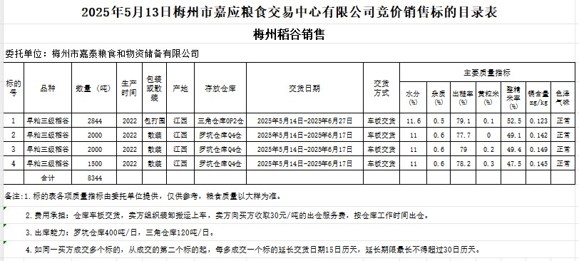 受客戶委托,梅州市嘉應(yīng)糧食交易中心有限公司定于2025年5月13日(星期二)舉辦糧食競價交易會。梅州市嘉泰糧食和物資儲備有限公司擬銷售2022年產(chǎn)早秈稻谷8344噸。