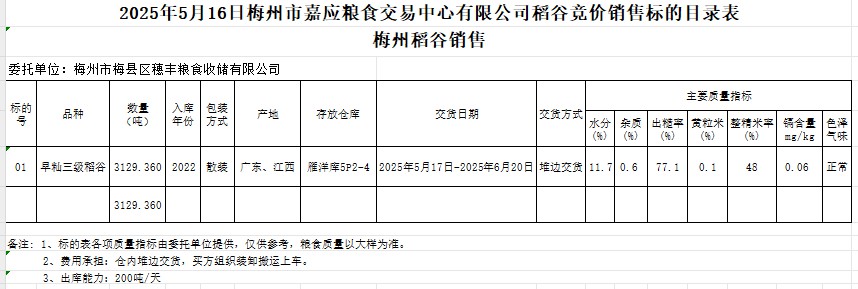 受客戶委托,梅州市嘉應(yīng)糧食交易中心有限公司定于2025年5月16日(星期五)舉辦糧食競價交易會。梅州市梅縣區(qū)穗豐糧食收儲有限公司擬銷售2022年產(chǎn)早秈稻谷3129.360噸。