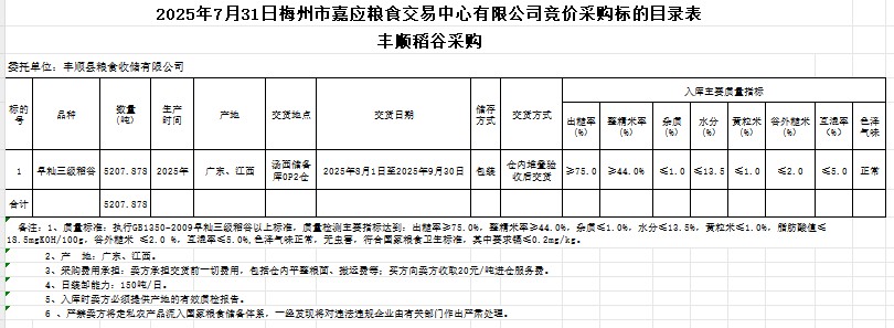 受客戶委托,梅州市嘉應(yīng)糧食交易中心有限公司定于2025年7月31日(星期四)舉辦糧食競(jìng)價(jià)交易會(huì)。豐順縣糧食收儲(chǔ)有限公司擬采購2025年產(chǎn)早秈稻谷5207.878噸。
