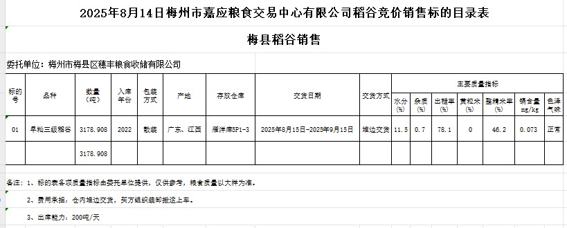受客戶委托,梅州市嘉應(yīng)糧食交易中心有限公司定于2025年8月14日(星期四)舉辦糧食競(jìng)價(jià)交易會(huì)。梅州市梅縣區(qū)穗豐糧食收儲(chǔ)有限公司擬銷(xiāo)售2022年產(chǎn)早秈稻谷3178.908噸。