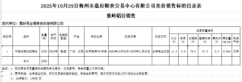 受客戶委托,梅州市嘉應糧食交易中心有限公司定于2025年10月29日(星期三)舉辦糧食競價交易會。蕉嶺縣金穗糧食收儲有限公司擬銷售2023年產(chǎn)中晚秈稻谷2200噸。