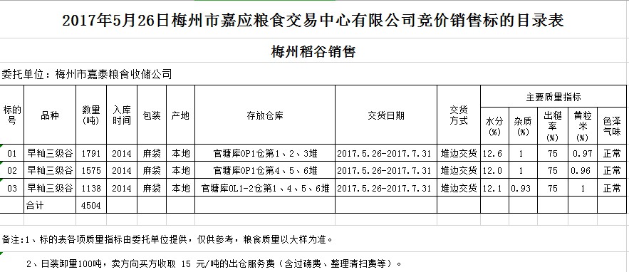 受客戶委托,梅州市嘉應(yīng)糧食交易中心有限公司定于2017年5月26日舉辦糧食競價交易會,梅州市嘉泰糧食收儲公司擬銷售早秈三級稻谷4504噸。