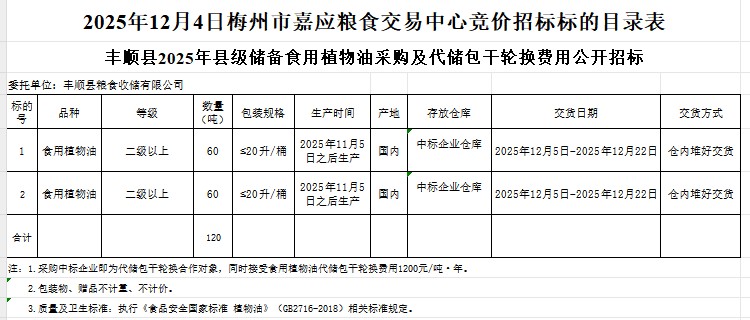 受豐順縣糧食收儲有限公司委托,梅州市嘉應(yīng)糧食交易中心有限公司定于2025年12月4日(星期四)上午10:00在廣東省梅州市彬芳大道南161號梅州市糧食交易中心3樓,舉辦豐順縣2025年縣級儲備食用植物油采購及代儲包干輪換費用公開招標。