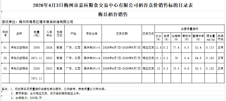 受客戶委托,梅州市嘉應(yīng)糧食交易中心有限公司定于2026年4月3日(星期五)舉辦糧食競(jìng)價(jià)交易會(huì)。梅州市梅縣區(qū)穗豐糧食收儲(chǔ)有限公司擬銷售2023年產(chǎn)早秈稻谷7971.11噸。