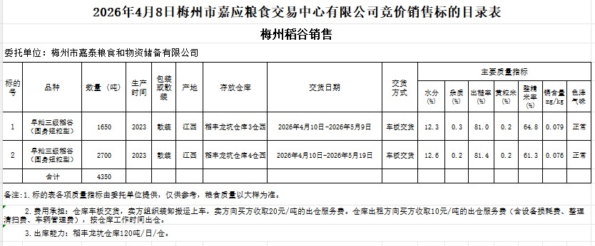 受客戶委托,梅州市嘉應(yīng)糧食交易中心有限公司定于2026年4月8日(星期三)舉辦糧食競(jìng)價(jià)交易會(huì)。梅州市嘉泰糧食和物資儲(chǔ)備有限公司擬銷售2023年產(chǎn)早秈稻谷(圓身短粒型)4350噸。