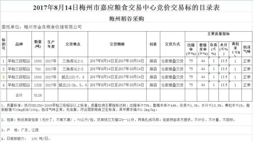 受客戶委托,梅州市嘉應(yīng)糧食交易中心有限公司定于2017年8月14日舉辦糧食競(jìng)價(jià)交易會(huì),梅州市金良糧食收儲(chǔ)有限公司擬采購(gòu)2017年早秈三級(jí)稻谷共5128噸。