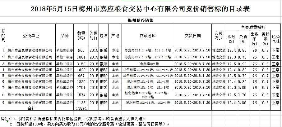 交易時間和地點:2018年5月15日(星期二)上午10時。廣東省梅州市彬芳大道南161號梅州市糧食交易中心3樓。