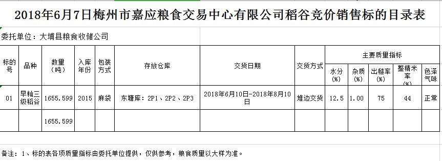 受客戶委托,梅州市嘉應(yīng)糧食交易中心有限公司定于2018年6月7日(星期四)舉辦糧食競(jìng)價(jià)交易會(huì),大埔縣糧食收儲(chǔ)公司擬銷售早秈稻1655.599噸。