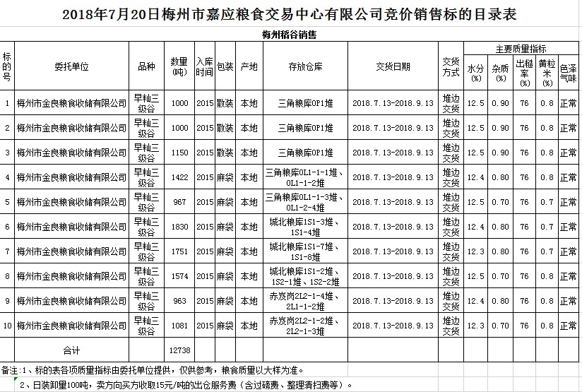 受客戶委托,梅州市嘉應(yīng)糧食交易中心有限公司定于2018年7月20日(星期五)舉辦糧食競價(jià)交易會(huì),梅州市金良糧食收儲(chǔ)有限公司擬銷售早秈稻12738噸。