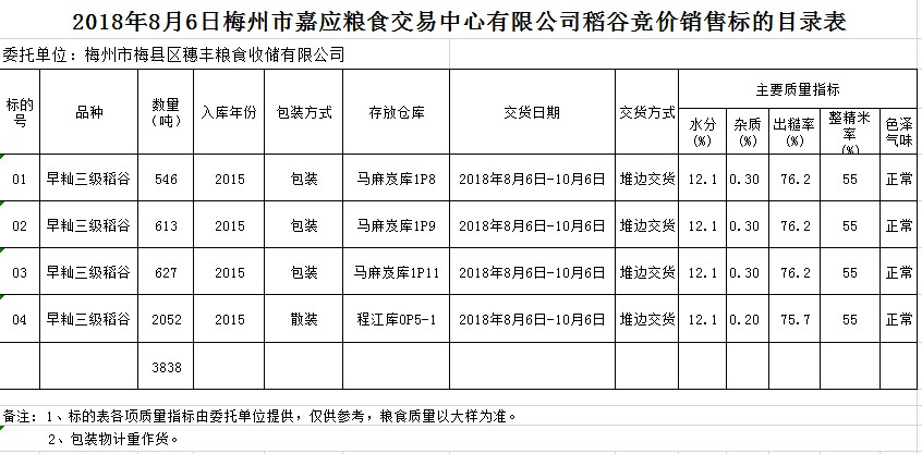 受客戶委托,梅州市嘉應(yīng)糧食交易中心有限公司定于2018年8月6日(星期一)舉辦糧食競價交易會,梅州市梅縣區(qū)穗豐糧食收儲有限公司擬銷售早秈稻3838噸。